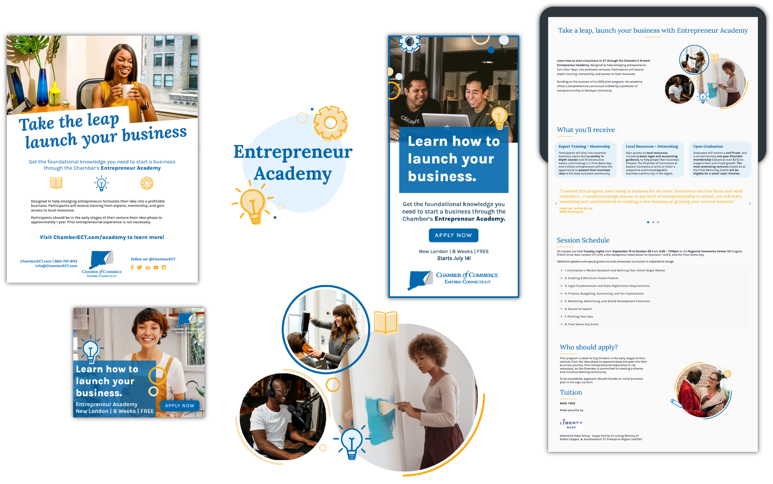 I played a key role in crafting the design for all marketing and program materials. Specifically, I focused on aligning the visuals with the Chamber's Innovation Center, seamlessly integrating the new branding elements of the Center with the Chamber's colors. This strategic approach aimed to establish a cohesive visual identity that effectively bridged the two organizations as we launched the Center.