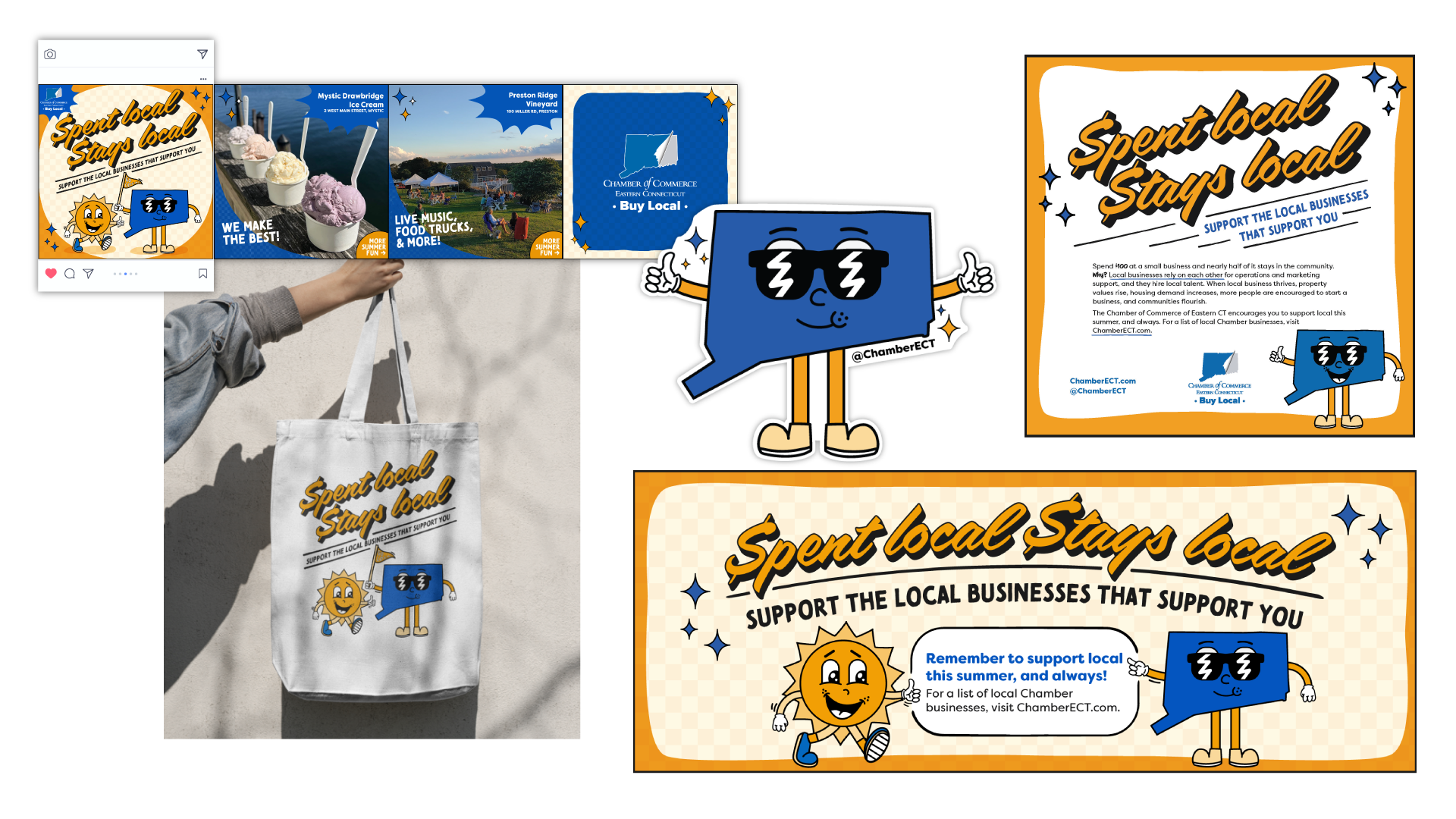 During the 2022 holiday season I created a new “Spent local, Stays local” campaign for the Chamber encouraging the community to ‘support the businesses that support you’. Ads were shared digitally on Facebook and Instagram, and in print through The Day Newspaper. The campaign was recreated for the 2023 summer with fresh colors and new mascots. The mascots have continued to be used to promote shopping locally.