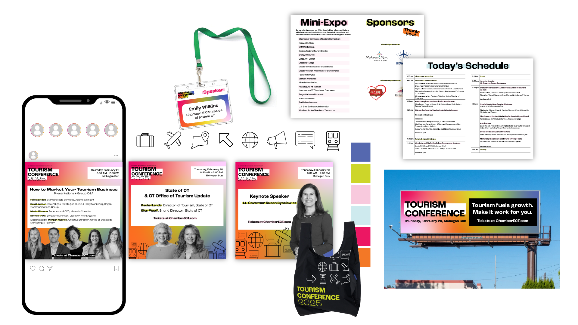 For the regional Tourism Conference held at Mohegan Sun, I had the opportunity to design all of the event materials, ensuring a seamless and cohesive experience for attendees. This included creating marketing materials to promote the conference, as well as day-of items such as name tags, programs, signage, and handouts. These materials were designed to reflect the vibrant tourism industry in eastern Connecticut, showcasing the region’s attractions and promoting the idea of tourism as an investment. The conference focused on leveraging new technology, including AI, to strategically market the area and ensure the right visitors are targeted to maximize economic impact..